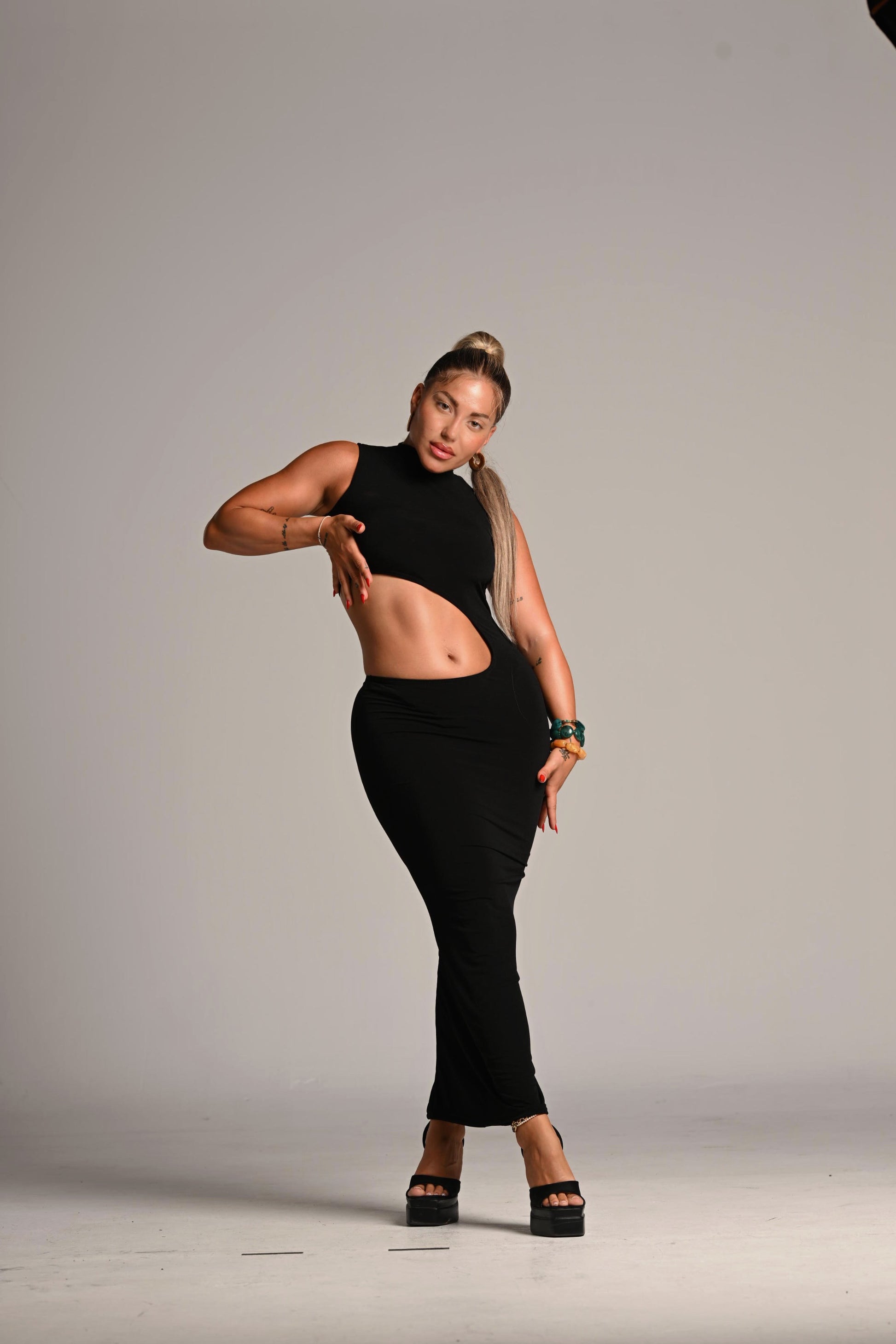 maxi φόρεμα με ημικύκλιο άνοιγμα στη κοιλιά
