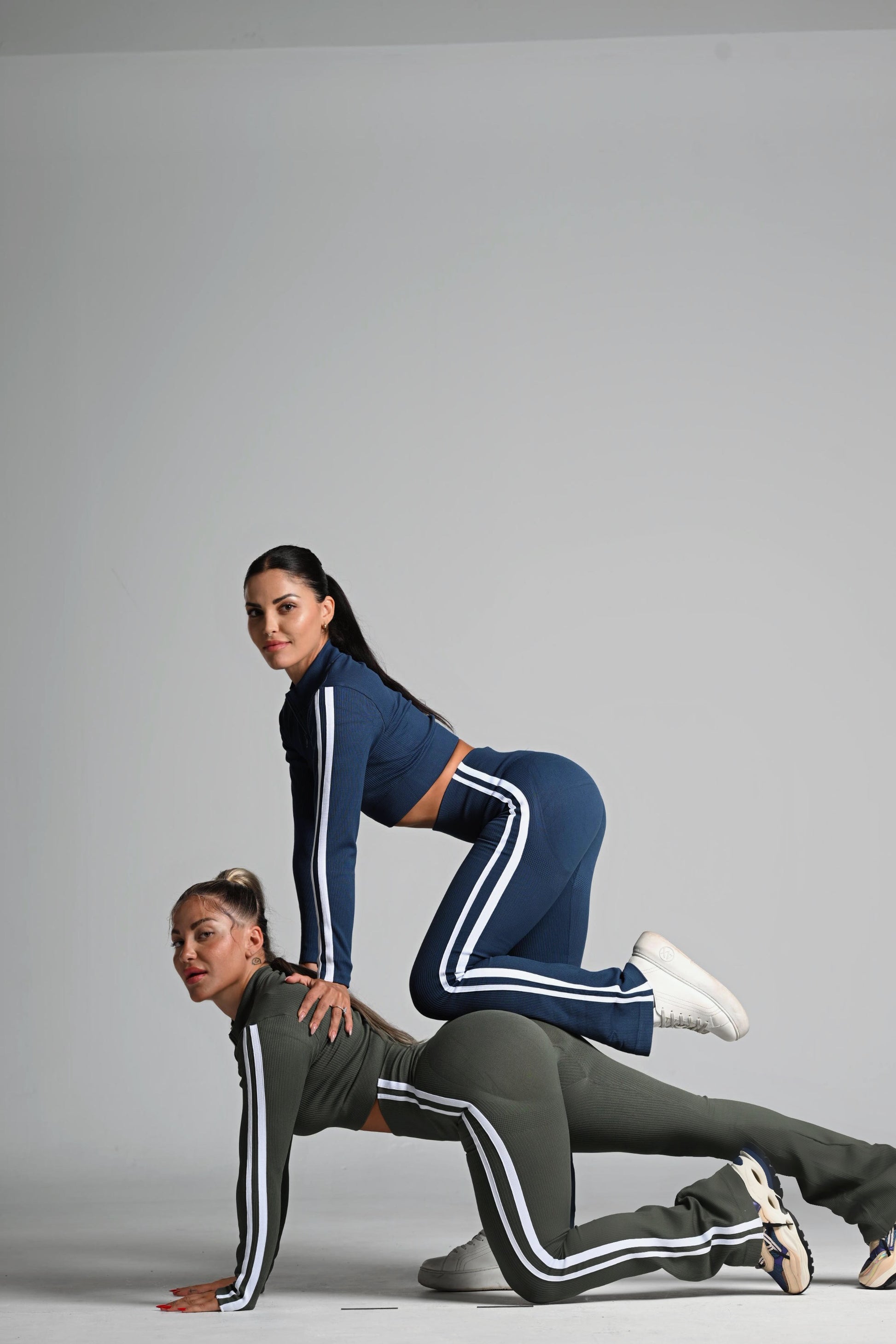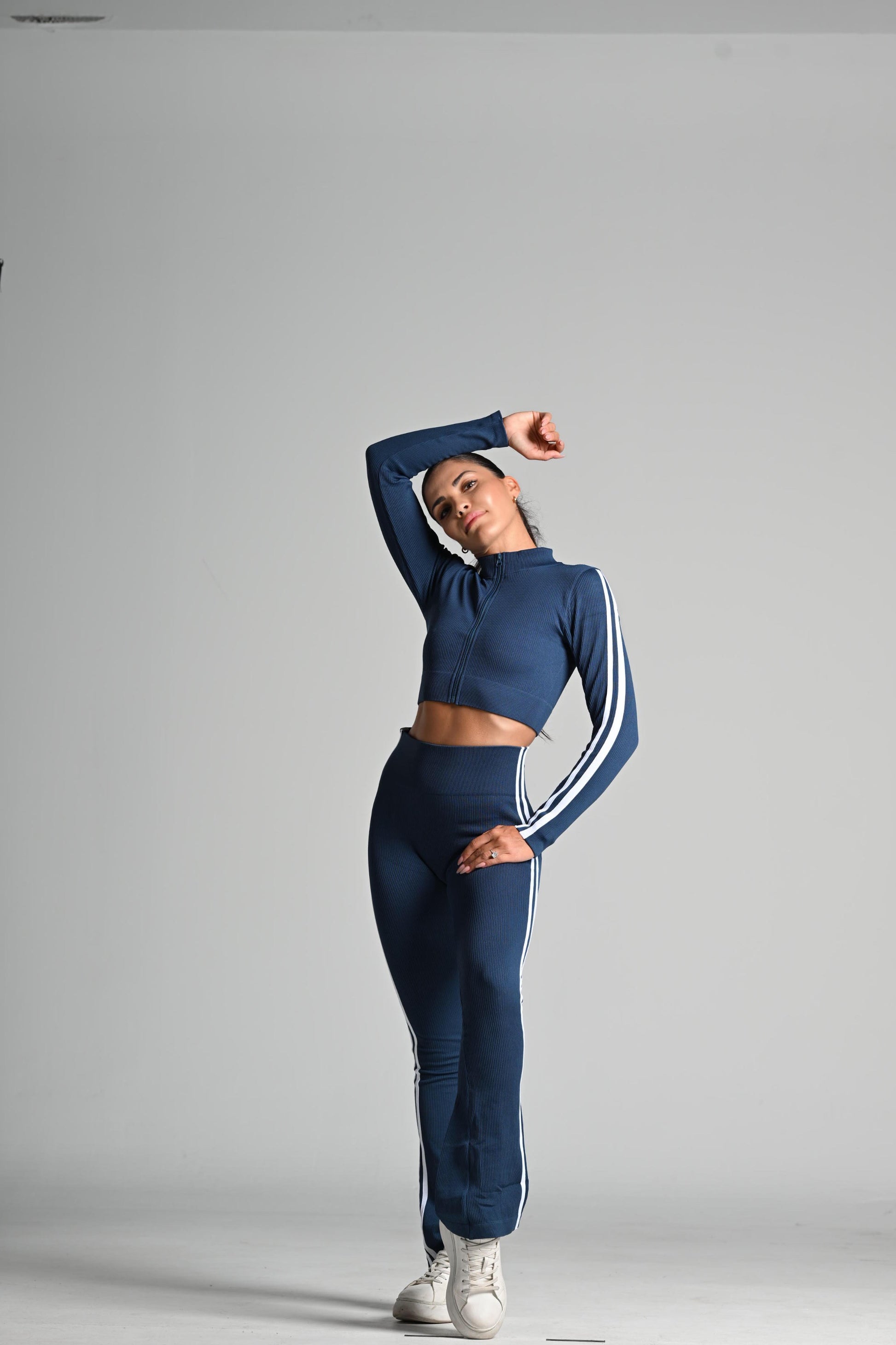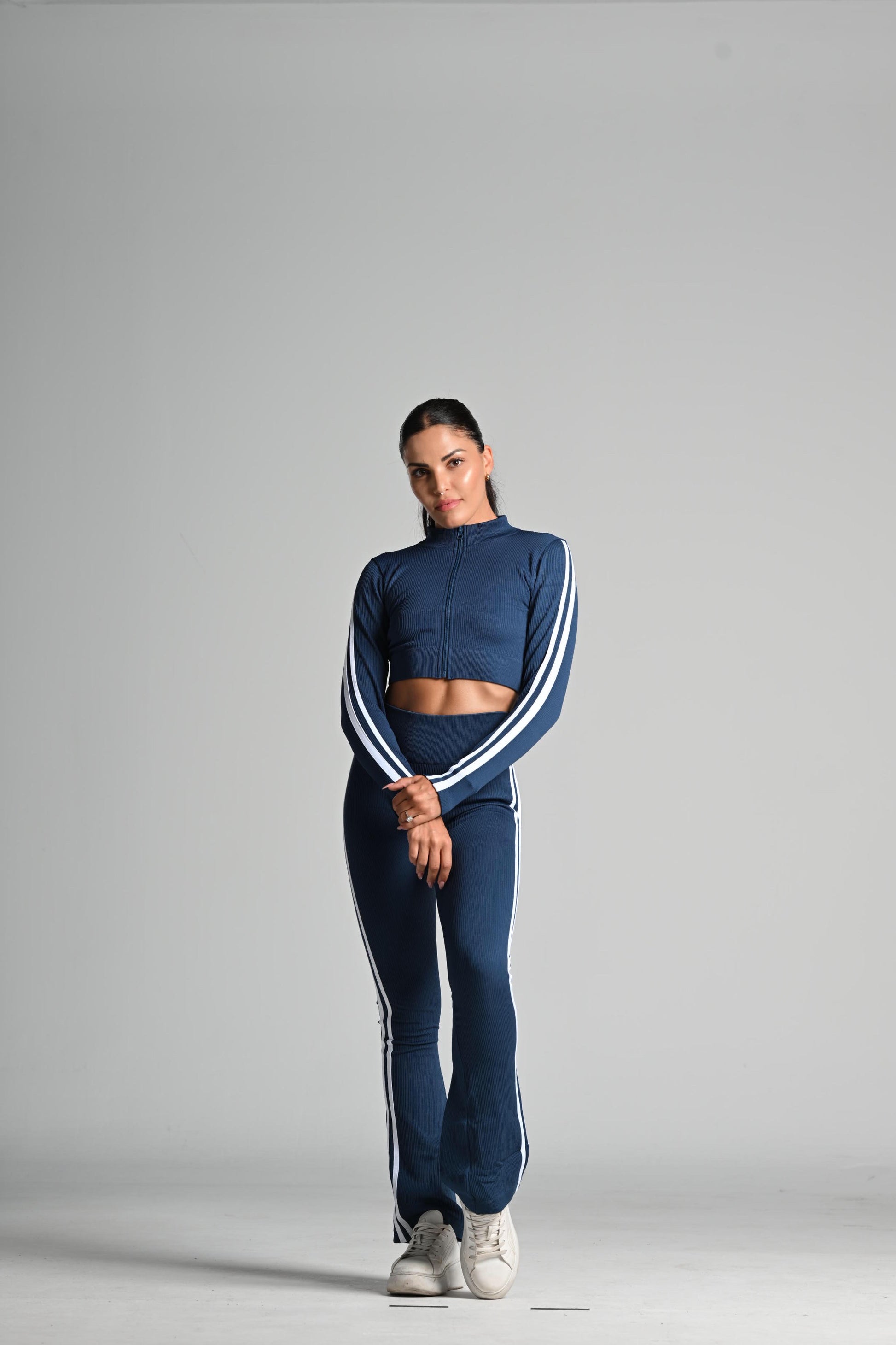 ριπ ελαστικό ύφασμα με ψηλομεσο παντελόνι τελείωμα καμπάνας και push up effect . Κάθετη διπλή λευκή ρίγα , cropped μακρυμάνικο ζακέτα